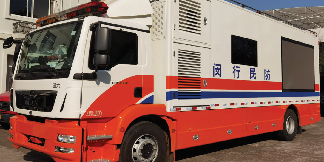 车内仅用话筒即可与超短波集群、内外线电话、手机、IP电话等开展组网会议;采用上海民防首例5GVPN通信系统,实现现场无线覆盖。