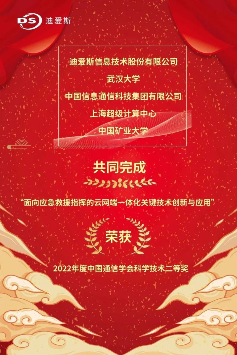近日,中国通信学会发布《2022年度中国通信学会科学技术奖奖励公告》,迪爱斯公司联合武汉大学、中国信息通信科技集团有限公司、上海超级计算中心、中国矿业大学共同完成的“面向应急救援指挥的云网端一体化关键技术创新与应用”项目荣获“2022年度中国通信学会科学技术二等奖”。